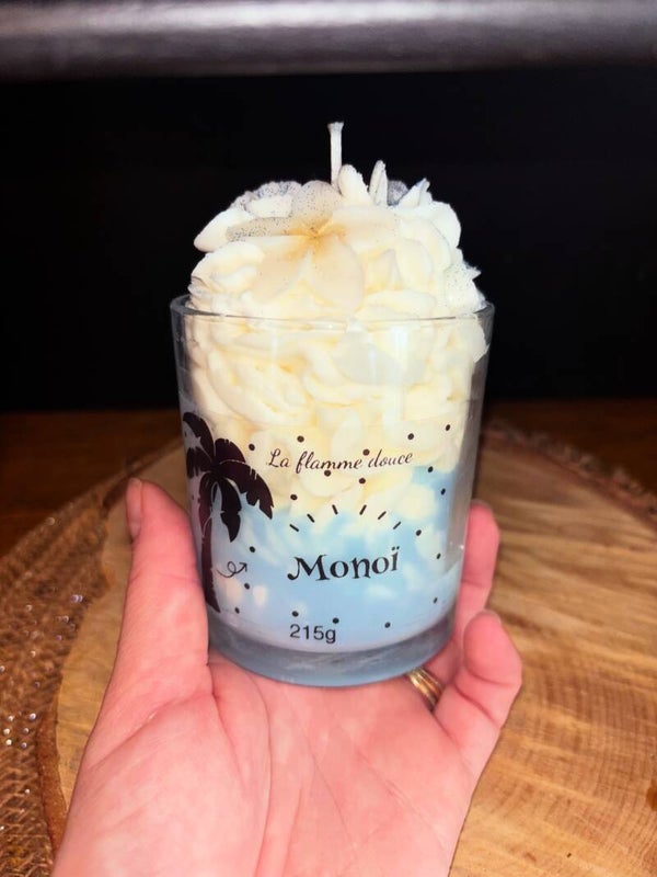 Bougie gourmande Monoï – Un parfum solaire et envoûtant aux notes de fleur de tiaré, coco et vanille. Coulée à la main, elle diffuse une fragrance douce et exotique qui évoque les vacances et le sable chaud. Parfaite pour une ambiance chaleureuse et dépaysante toute l’année. 🌴✨