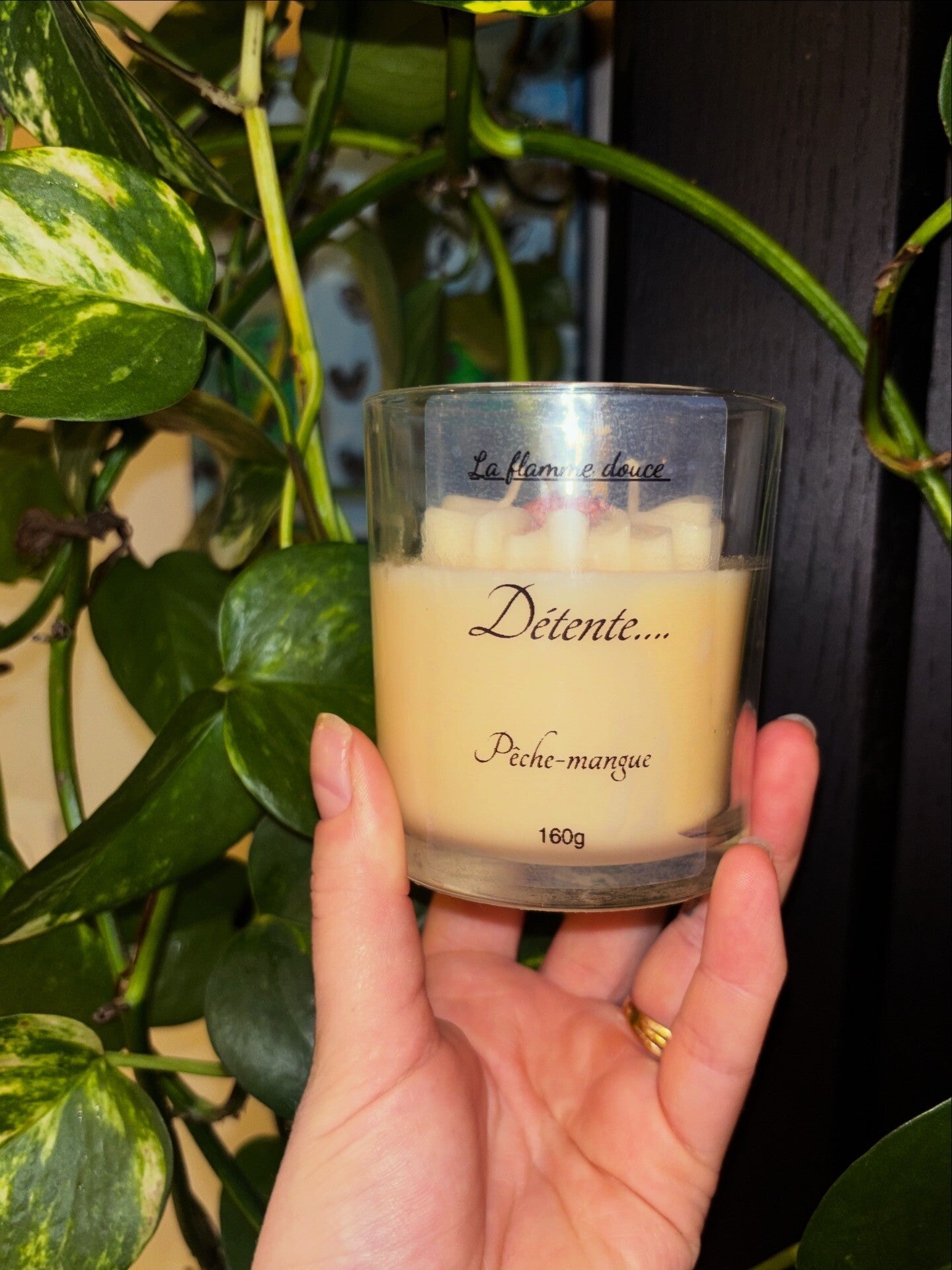 Offrez à votre intérieur une escapade ensoleillée avec la bougie Pêche Mangue. Son parfum fruité et exotique marie la douceur juteuse de la pêche à la fraîcheur sucrée de la mangue, pour une ambiance chaleureuse et lumineuse.
